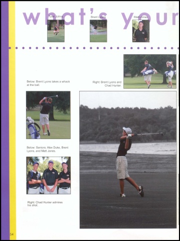 w • • • • • • • • • • • • • • • • • • • • • • • • Below: Brent Lyons takes a whack Right: Brent Lyons and at the ball. Chad Hunter. Below: Seniors: Alex Duke, Brent Lyons, and Matt Jones. Right: Chad Hunter admires his shot.