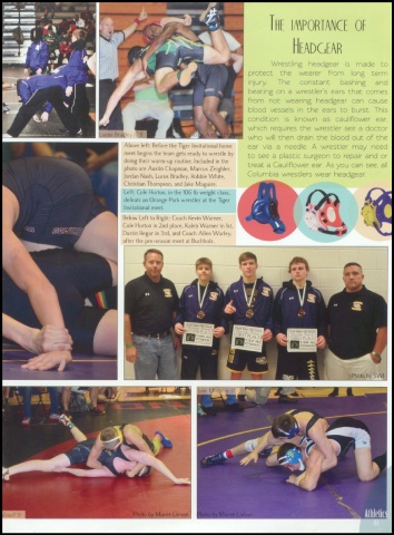 Jordan Nash, Lucus Bradley, Robbte Whtte, Columbia wrestlers wear headgear.