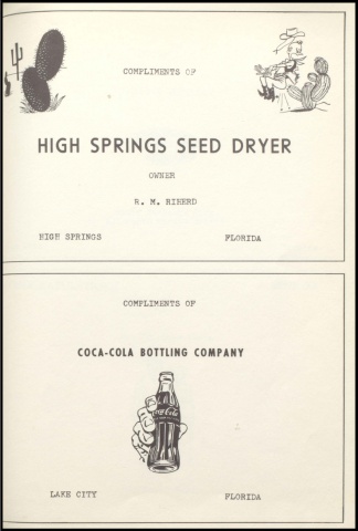 COMPLIMENTS OF HIGH SPRINGS SEED DRYER OWNER R. M. RIEERD HIGH SPRINGS FLORIDA COMPLIMENTS OF COCA-COLA BOTTLING COMPANY LAKE CITY FLORIDA