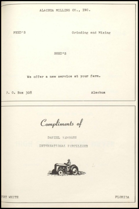 ALACHUA MILLING CO., INC. FEED'S Grinding and Mixin~ SEED'S We offer a new service at your farm. P. 0. Box 308 Alachua INTE'RHATTO_TAJ F , TILIZER FORT WHITE FLORIDA